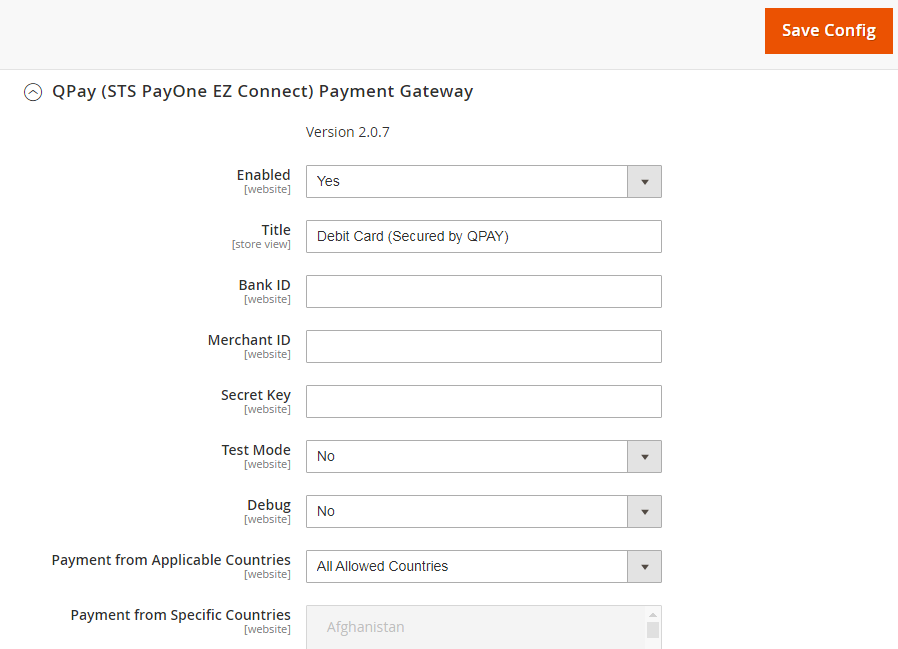 - Enabled: should be set to YES to make QPay Payment Gateway (PayOne EZ Connect) available as a payment method on the checkout page.